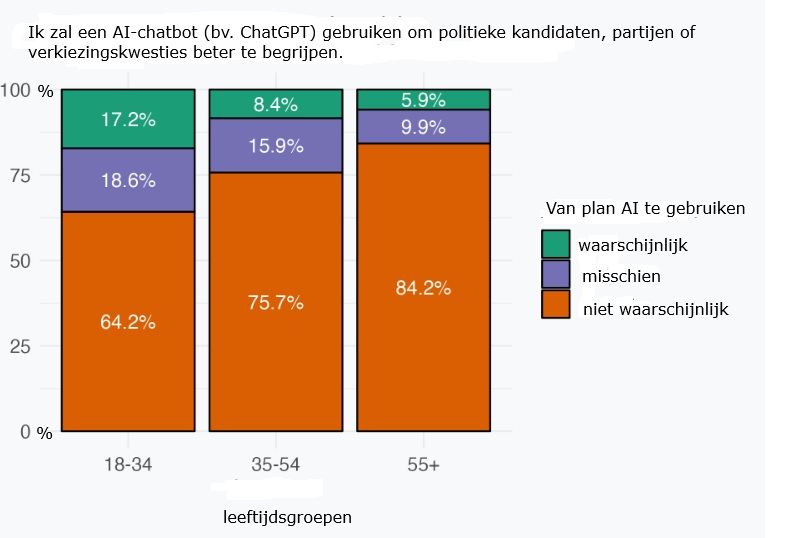 In aanloop naar de verkiezingen werd aan 1220 deelnemers uit het LISS panel gevraagd hoe waarschijnlijk het was dat zij ChatGPT of een andere AI-chatbot zouden gebruiken voor advies over politieke partijen, kandidaten of thema’s.