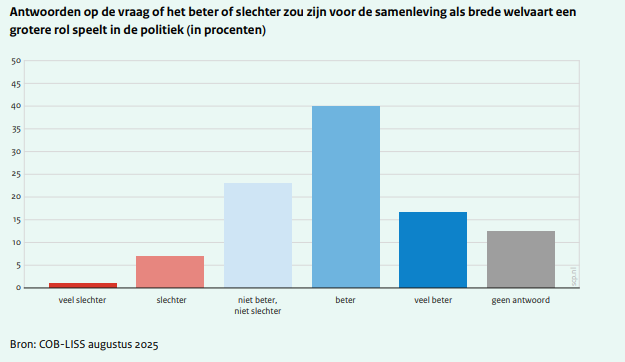 Burgers willen meer brede welvaart in de politiek, maar denken niet dat dat gaat lukken 57% van de Nederlanders geeft aan dat het (veel) beter zou zijn voor de Nederlandse samenleving als brede welvaart een grotere rol speelt in de politiek (8% denkt dat het slechter is). Ze geven aan dat de politiek dat tot nu toe te weinig doet. Toch denken mensen niet dat het de politiek gaat lukken om dat voor elkaar te krijgen: eigenbelang en onenigheid onder politici belemmert het ontwikkelen van een langetermijnvisie die nodig is voor een gedegen toepassing van het bredewelvaartsperspectief.