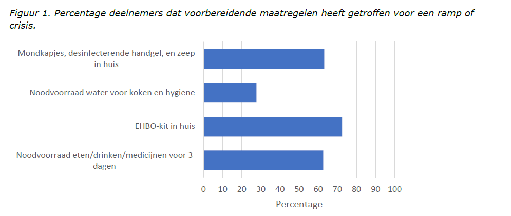 o Paraatheid gedrag: Ruim eenderde van de deelnemers heeft geen noodvoorraad eten/drinken en medicijnen om drie dagen vooruit te kunnen. Meer dan tweederde heeft geen noodvoorraad water voor hygiëne en koken. Jonge deelnemers (< 40 jaar) en deelnemers in stedelijke gebieden treffen de gevraagde voorbereidingen minder dan gemiddeld. Een mogelijke verklaring is ruimtegebrek voor het opslaan van noodvoorraden.