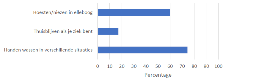 o Hygiëne- en isolatiegedrag: Zes op de tien deelnemers hebben de gewoonte om te hoesten en te niezen in de elleboog. Minder dan de helft wast de handen bij thuiskomst of na hoesten, niezen of het snuiten van de neus. Minder dan twee op de tien blijven thuis bij ziekte.