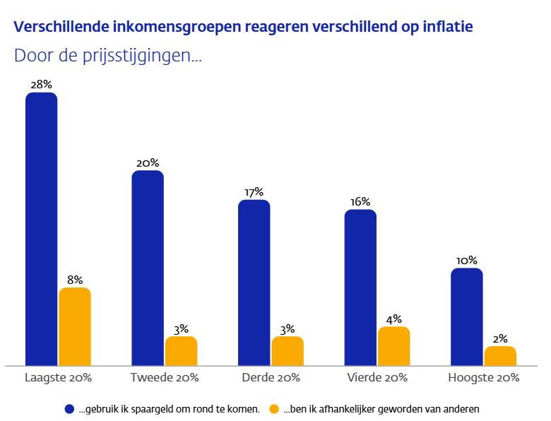 Koopkrachtverandering wordt vaak in procenten weergegeven. Maar zo’n procentuele verandering zegt niet alles over hoe mensen dit in het dagelijks leven voelen. Voor huishoudens die leven van een laag inkomen, kan een koopkrachtdaling van een paar procent grote gevolgen hebben. Zij hebben vaak weinig tot geen financiële buffer en moeten keuzes maken over basisbehoeften zoals energie, voeding of zorg. Rijkere huishoudens kunnen zulke schommelingen meestal beter opvangen. Zo laat de onderstaande figuur bijvoorbeeld zien dat armere huishoudens door de prijsstijgingen vaker spaargeld zijn gaan gebruiken en vaker afhankelijk zijn geworden van anderen.